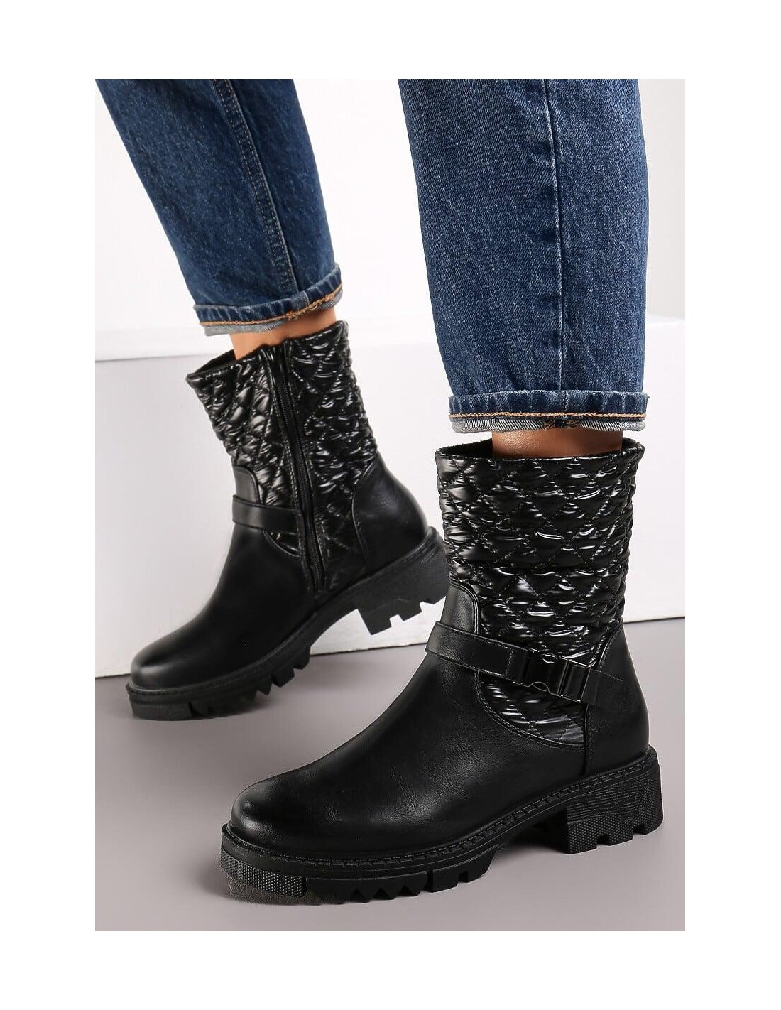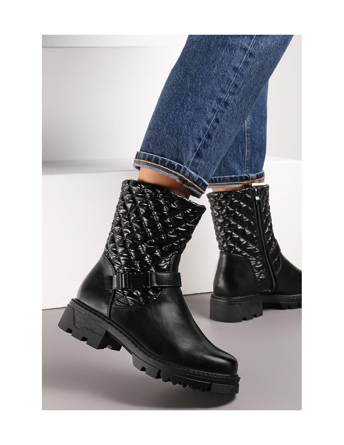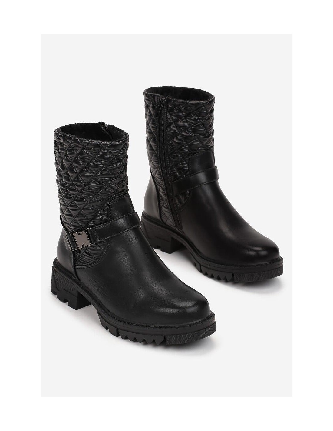 Magnifiques bottines noires Carola en bi-matière, associant similicuir et effet matelassé, avec un bout rond. Elles disposent d’une semelle extérieure crantée et antidérapante de 2 cm, d’un intérieur fourré offrant une excellente conservation de la chaleur, ainsi que d’un talon cranté de 5 cm. La tige mesure 18 cm et une ceinture décorative avec boucle entoure élégamment la cheville.